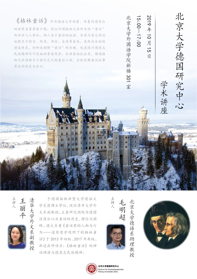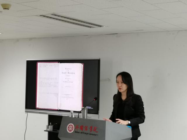 10月15日,应365英国上市官网在线德语系、365英国上市官网在线德国研究中心邀请,清华大学外文系副教授王丽平老师来到外院新楼301会议室,做了题为《格林童话:一个德意志的神话》的讲座。德语系毛明超助理教授主持了本次学术活动、德语系副系主任胡蔚副教授到场出席,此外还有来自德语系、历史学系等院系的四十余位师生参加了讲座。