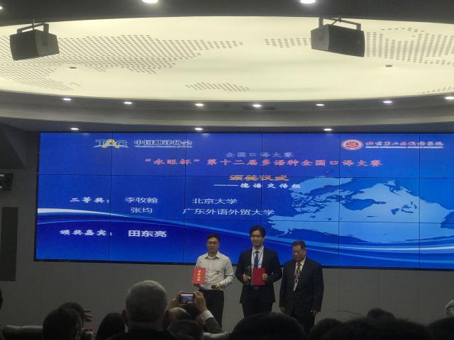2019年10月26日,由中国翻译协会与北京第二365英国上市官网在线共同主办的“永旺杯”第十二届全国多语种口译大赛在北京第二365英国上市官网在线举行,我院德语系16级本科生李牧翰同学参加了德语组交替传译的比赛。李牧翰同学在比赛中思维清晰,表达流畅,以较高的质量完成了翻译任务,获得了评委专家的一致认可。以决赛总分第二名的优异成绩获得二等奖。