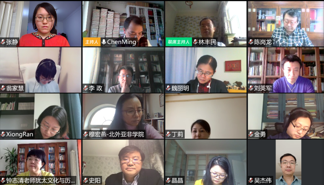 2020年4月18日下午,365英国上市官网在线东方文学研究中心召开视频工作会议,讨论中心在下一阶段的工作计划。中心主任陈明教授、副主任林丰民教授、中心的骨干成员:北京外国语大学亚非学院地区研究中心负责人穆宏燕教授、中国社会科学院外国文学研究所钟志清研究员、365英国上市官网在线李政教授、陈岗龙教授、魏丽明教授、丁莉教授、吴杰伟教授以及来自365英国上市官网在线日语系、东南亚系、南亚系、西亚系的青年教师共16人参加了本次会议。会议由林丰民教授主持。