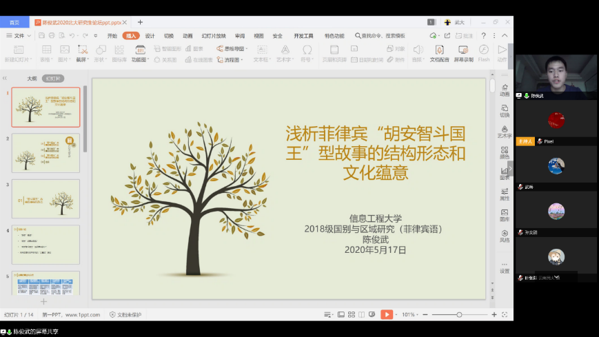 随后,四位学生代表阮诗芸、陈仁靖、陈娟、龚若晴就各自的获奖论文《从双重叙事进程看<射雉赋>英译》《浅析影响中泰铁路项目推进的泰国国内博弈——从2019年泰国大选说起》《基于评价理论的中韩新闻评论态度资源的人际意义对比研究》《尼卡诺尔•帕拉“反诗歌”的日常性》做了学术汇报。