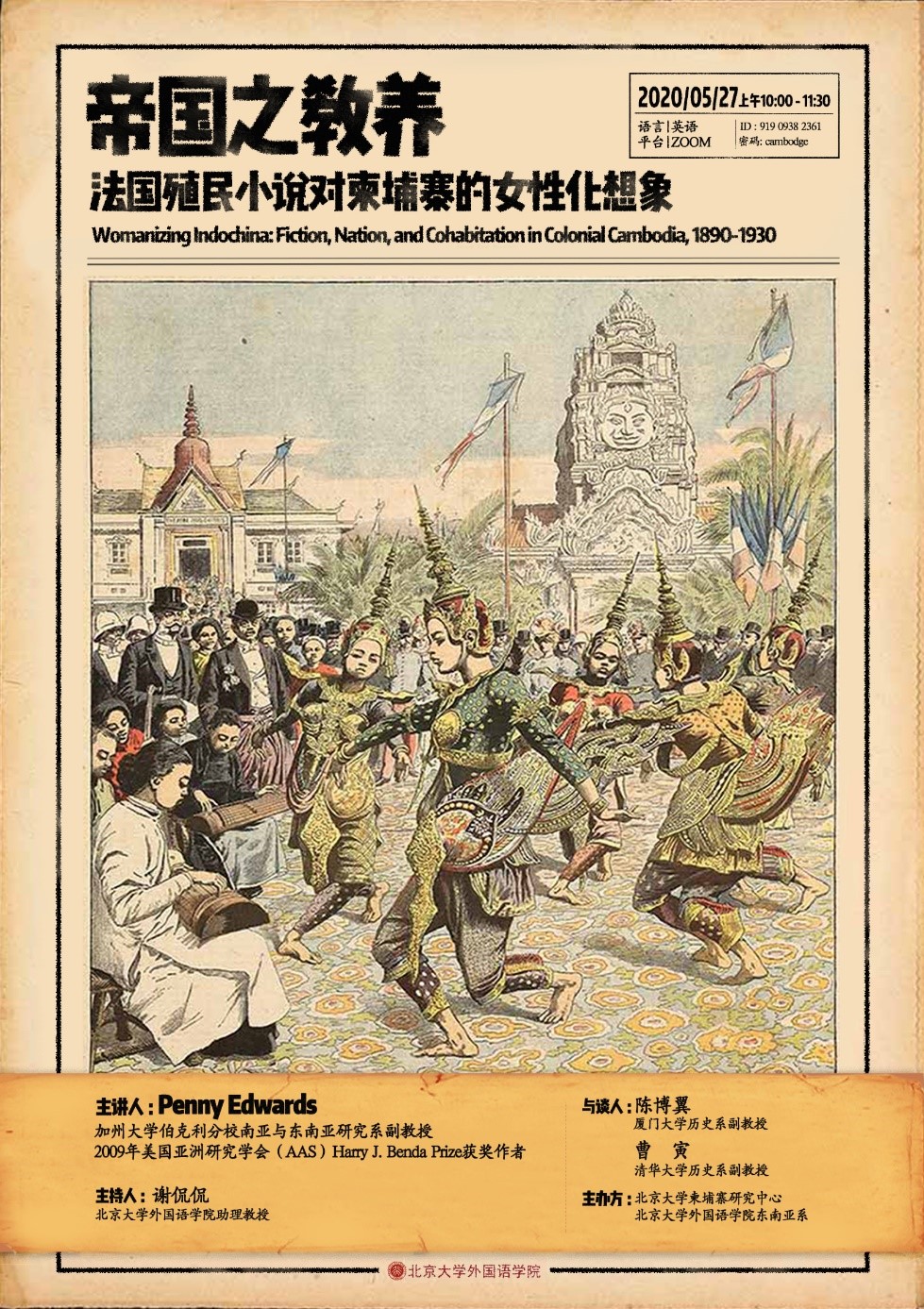 2020年5月27日,世界著名东南亚研究学者、加州大学伯克利分校南亚与东南亚研究系副教授Penny Edwards为外院师生进行了一场在线讲座,主题为“帝国之教养:法国殖民小说对柬埔寨的女性化想象”。讲座由365英国上市官网在线柬埔寨研究中心和外院东南亚系主办,谢侃侃博士主持,相关院系及兄弟院校的数十名师生参加了此次在线研讨。