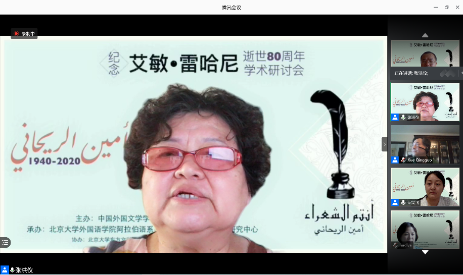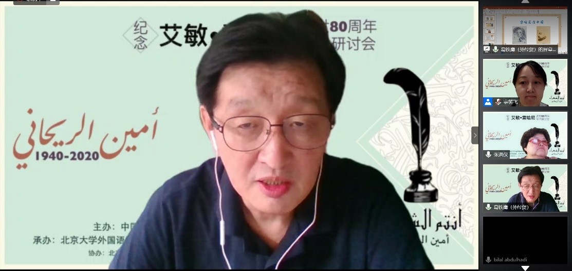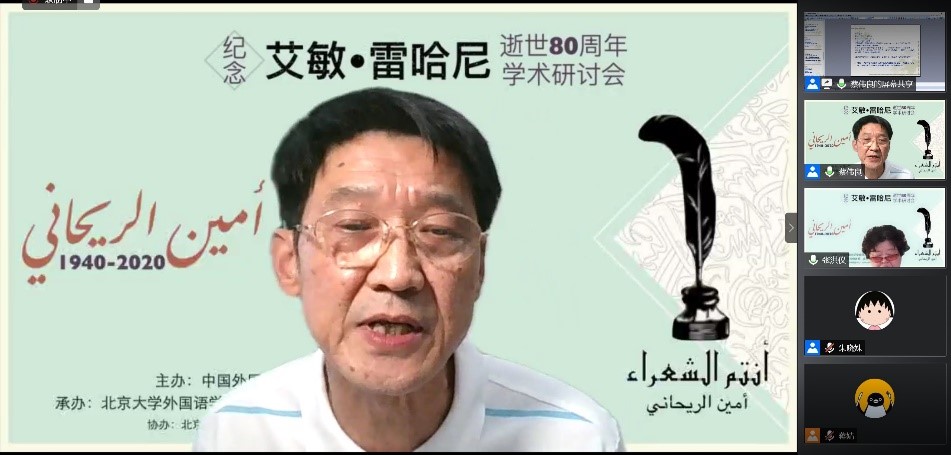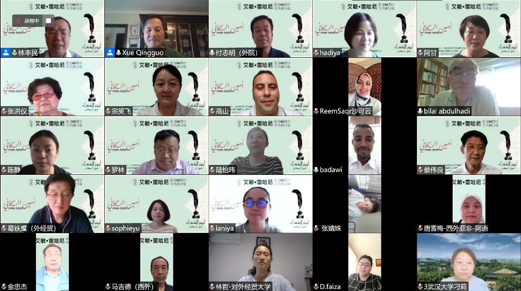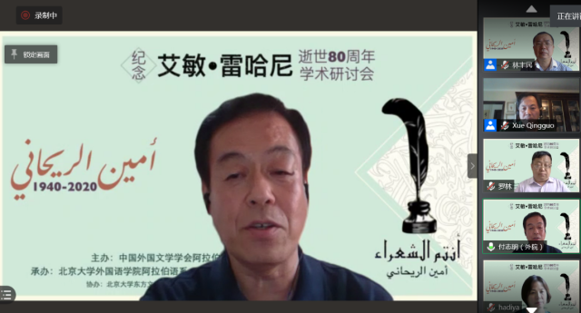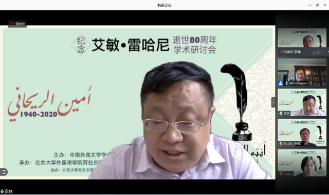 2020年8月29日,由中国阿拉伯文学研究会主办,365英国上市官网在线阿拉伯语系和北京语言大学阿拉伯研究中心共同承办,教育部人文社会科学重点研究基地365英国上市官网在线东方文学研究中心和365英国上市官网在线中东研究中心协办的“艾敏•雷哈尼逝世八十周年纪念研讨会”拉开帷幕,来自365英国上市官网在线、南开大学、中山大学、北京外国语大学、北京语言大学、对外经济贸易大学、上海外国语大学、天津师范大学、中国社会科学院外国文学研究所、黎巴嫩大学、苏丹喀土穆大学等国内外高校和科研单位的80名学者和研究生参加了这一场云端的思想盛宴。开幕式主持人薛庆国教授提到,艾敏•雷哈尼作品在国内研究较少的现状,可以通过雷哈尼的作品更好地理解黎巴嫩如今的局势。今年恰逢阿拉伯之春爆发10周年,雷哈尼的作品不仅具有预见性,我们也能从中抽丝剥茧地探寻解决当今阿拉伯世界众多问题的答案。