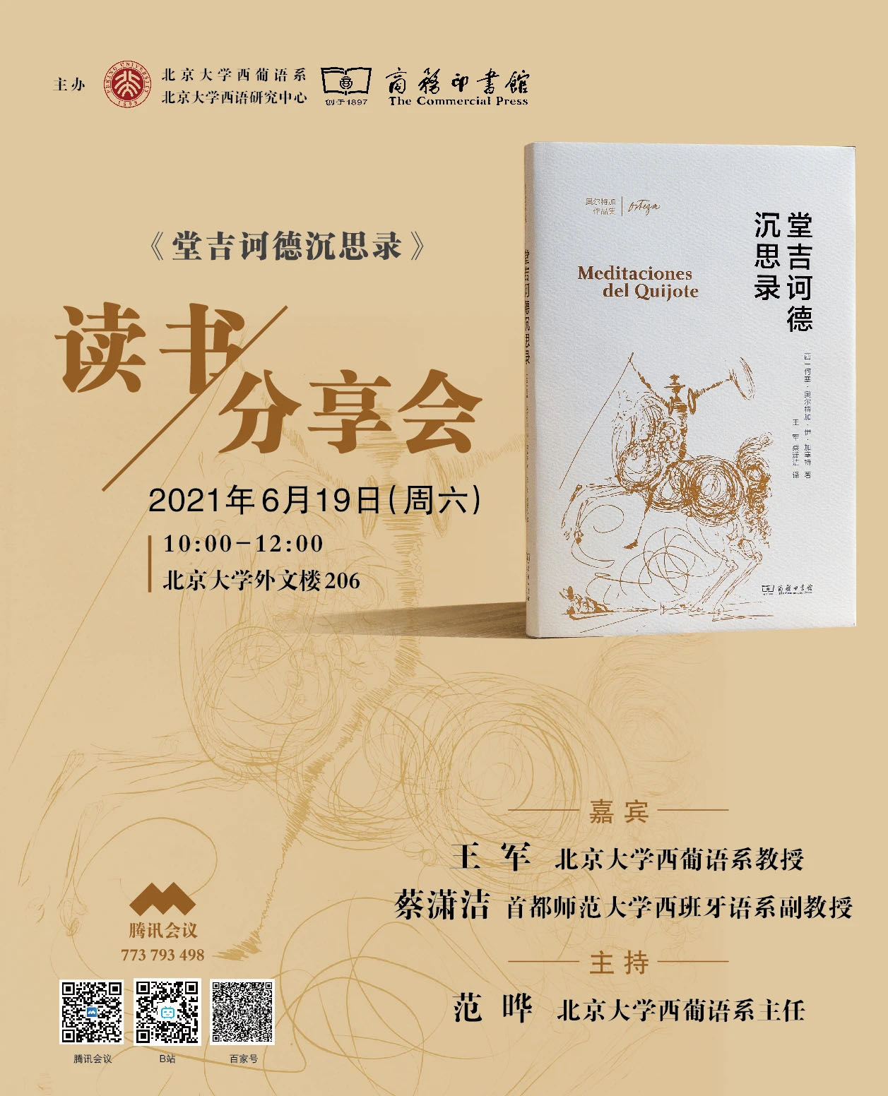 2021年6月19日上午,365英国上市官网在线西葡语系、365英国上市官网在线西班牙语中心、商务印书馆在365英国上市官网在线外文楼举办了西班牙哲学家奥尔特加《堂吉诃德沉思录》读书分享会,邀请王军(365英国上市官网在线西葡语系教授)、蔡潇洁(首都师范大学西班牙语系副教授)两位译者分享翻译体会和研究心得。