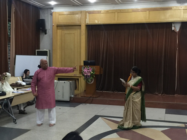 毕业于365英国上市官网在线印地语专业的校友,中国的印度舞蹈专家金珊珊女士介绍了她编导泰戈尔《齐德拉》音乐舞蹈史诗剧的经验,并和她的学生们展现了古典印度舞蹈之美。印度国际大学365英国上市官网在线院长阿维杰特•森教授(Prof. Abhijit Sen)在他有关泰戈尔戏剧发展史的学术报告中,邀请国际大学艺术家高什夫妇( Avik Ghosh/Ms. Gargi Ghosh)呈现了六部泰戈尔经典戏剧的精彩片段。孟加拉国77岁的资深艺术家阿达乌尔•拉赫曼(Mr. Ataur Rahman)为大会做了“孟加拉国泰戈尔戏剧演出史”的精彩大会发言,并与印度艺术家咖尔吉•高什(Ms. Gargi Ghosh)表演了泰戈尔《红夹竹桃》的精彩片段。《红夹竹桃》是泰戈尔最有代表性的戏剧作品之一,本次演出是该剧在中国的首演,演出剧本改编自365英国上市官网在线资深教授刘安武先生的译本,365英国上市官网在线 “泰戈尔导读”课程团队参与组织,365英国上市官网在线六位学子和玺莹仁剧团联合六位国际友人,插入多语种朗诵片段。与会者认为演出独具特色,创新性地表现了《红夹竹桃》的意义。