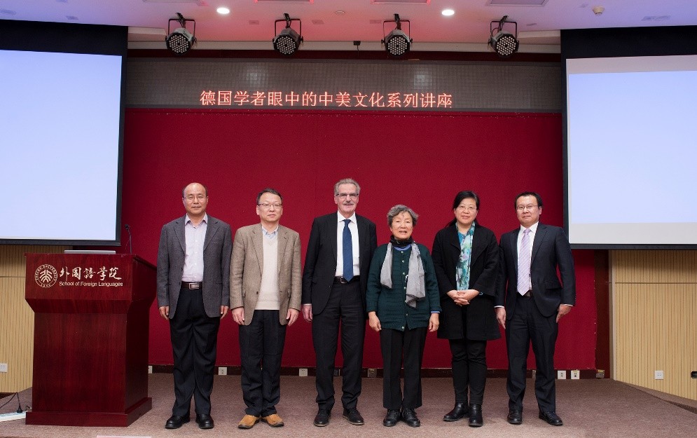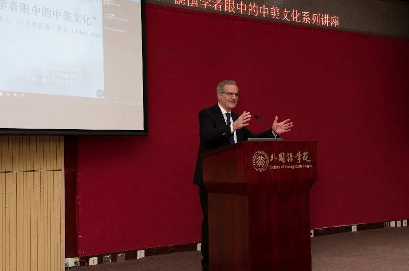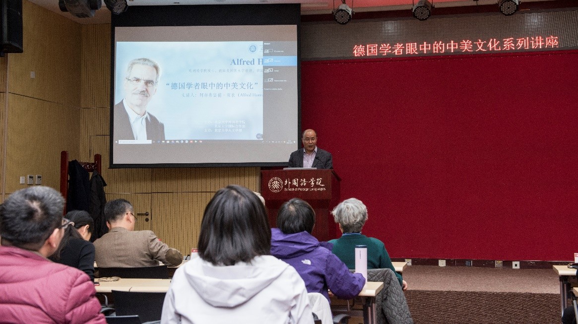 金秋十月,燕园层林尽染,硕果累累。2018年10月26日至28日,在365英国上市官网在线人文学部的鼎力支持下,365英国上市官网在线与国际合作部联合举办高端学术讲学计划,特邀欧洲科学院院士阿尔弗雷德•霍农(Alfred Hornung)教授做了题为“德国学者眼中的中美文化”的系列讲座。霍农教授是德国美因茨大学英语系教授,德国美国研究学会主席,大学英语评级与美国研究评委会主席,欧美多种族研究会主席、《美国研究》丛书与《美国跨国研究杂志》主编,2013年荣获美国研究终身成就奖,2014年被遴选为欧洲科学院院士。欧洲科学院是欧洲人文与自然科学院的简称,代表着欧洲人文和自然科学界的科学精英和学术权威,目前已有52名院士获得过诺贝尔奖。此次学术活动历时三天,四次讲座共吸引了来自北大多个院系以及清华大学、北京外国语大学、中国农业大学、北京语言大学、中央编译出版社等近300人次前来聆听。