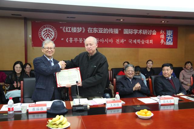 接下来由365英国上市官网在线东方文学研究中心主任王邦维教授向崔溶澈教授颁发了“《红楼梦》在东亚的传播”课题负责人聘书。