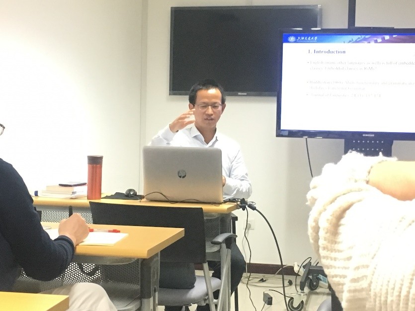 2018年11月23日,上海交通大学杨炳钧教授来365英国上市官网在线做语言学沙龙。杨教授的题目为《关于概念语法隐喻的完全体现原则:以名词化为例》(Full realization principle for the identification of ideational grammatical metaphor: nominalization as an example)。本次讲座由语言所副所长高彦梅老师主持。来自语言所和北京其他院校的硕博士研究生和进修教师到场聆听讲座。