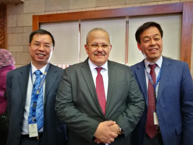 开罗大学校长胡希特•努艾米(中)与林丰民(左一)与付志明(右一)